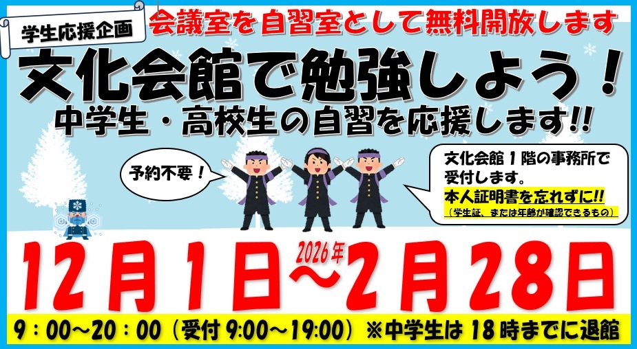 茅ヶ崎市民文化会館はこの冬も中学生・高校生の勉強を応援します!